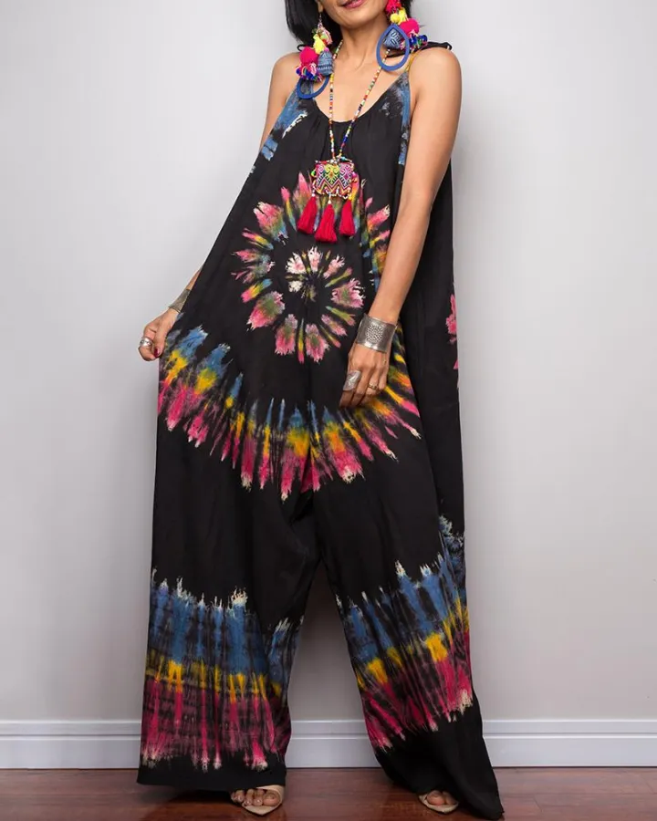 Tie-Dye Print Wide-Leg Lace-Up Loose Jumpsuit